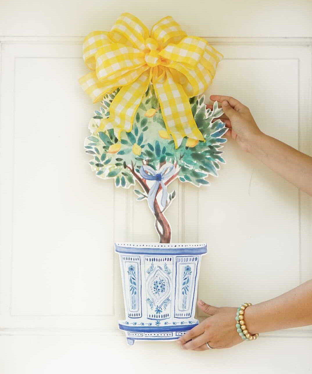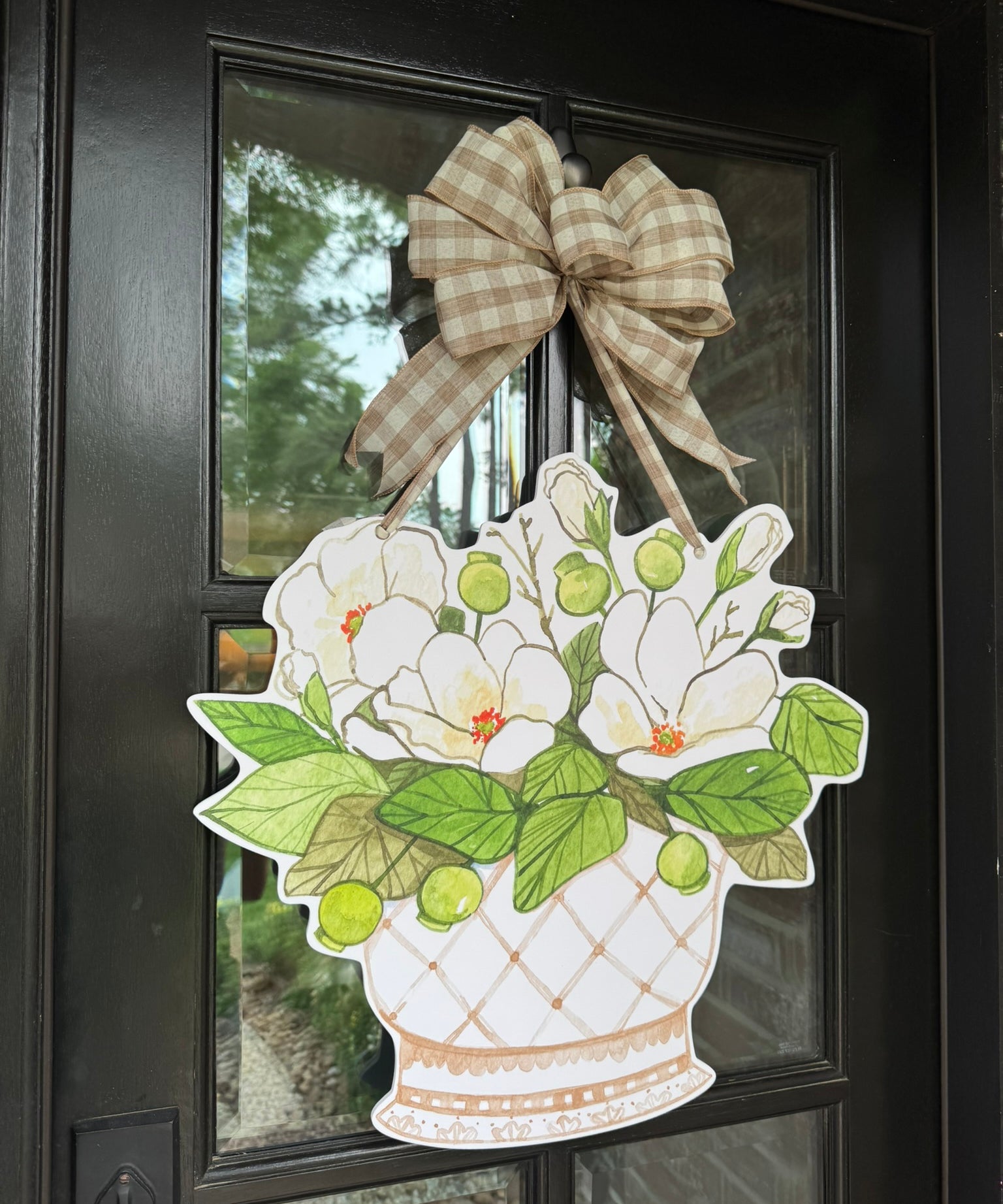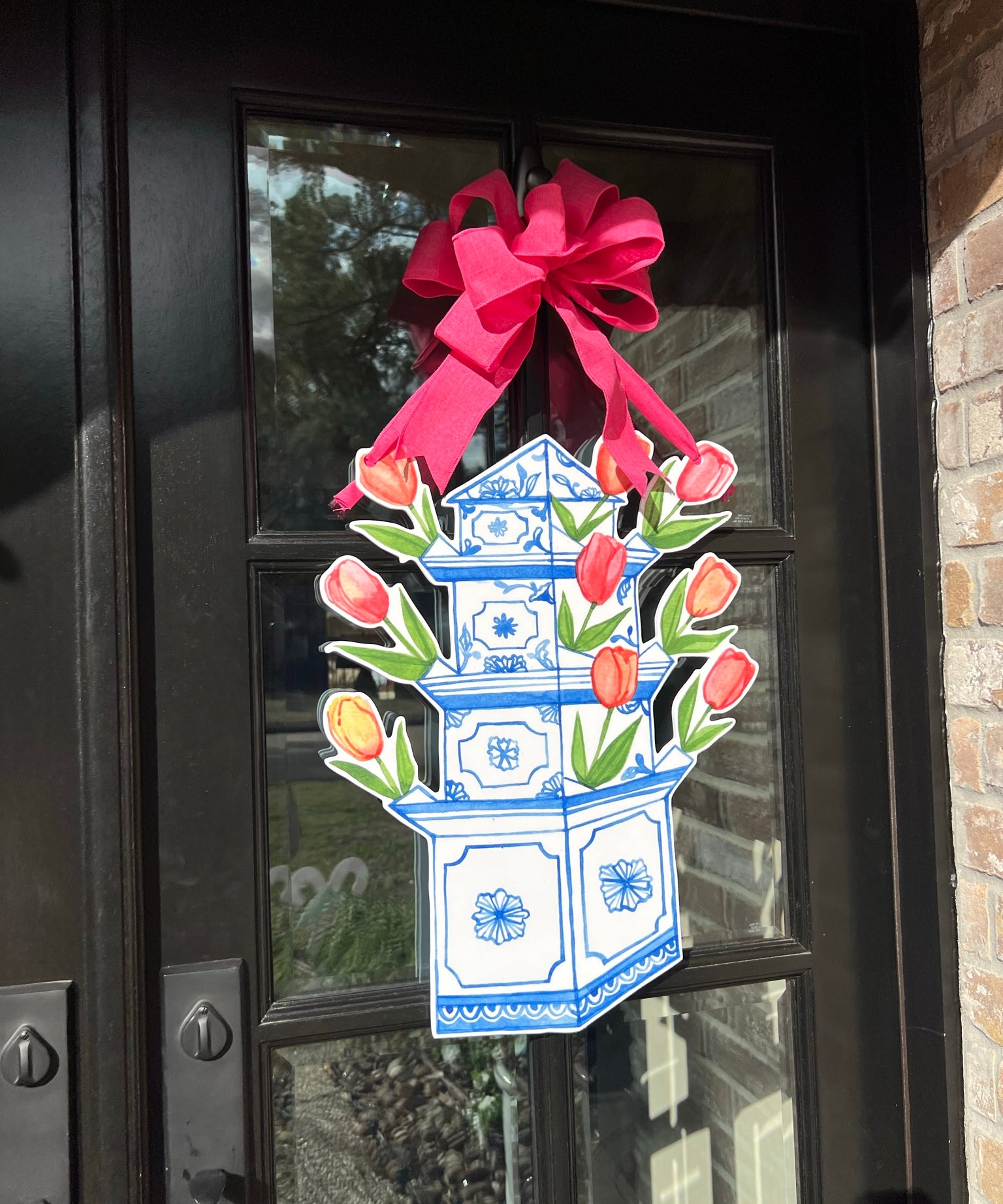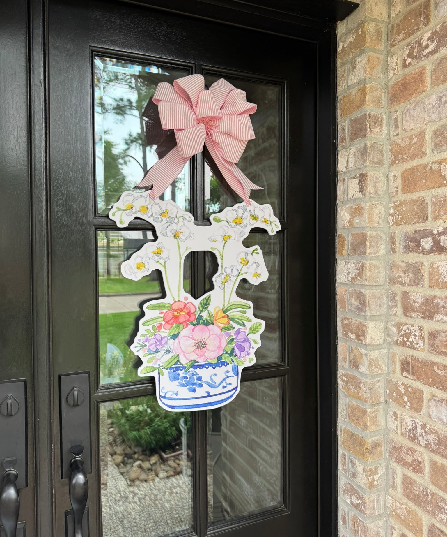 The Amy is the first ever Home Themed Home door hanger!! It pairs the love I have for boxwoods planters and chinoiserie.
