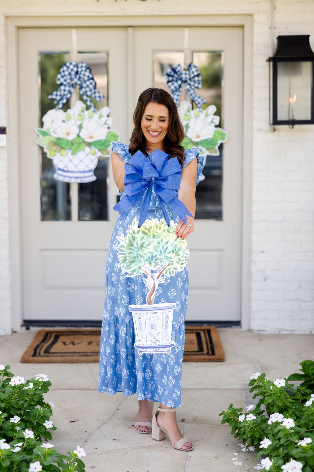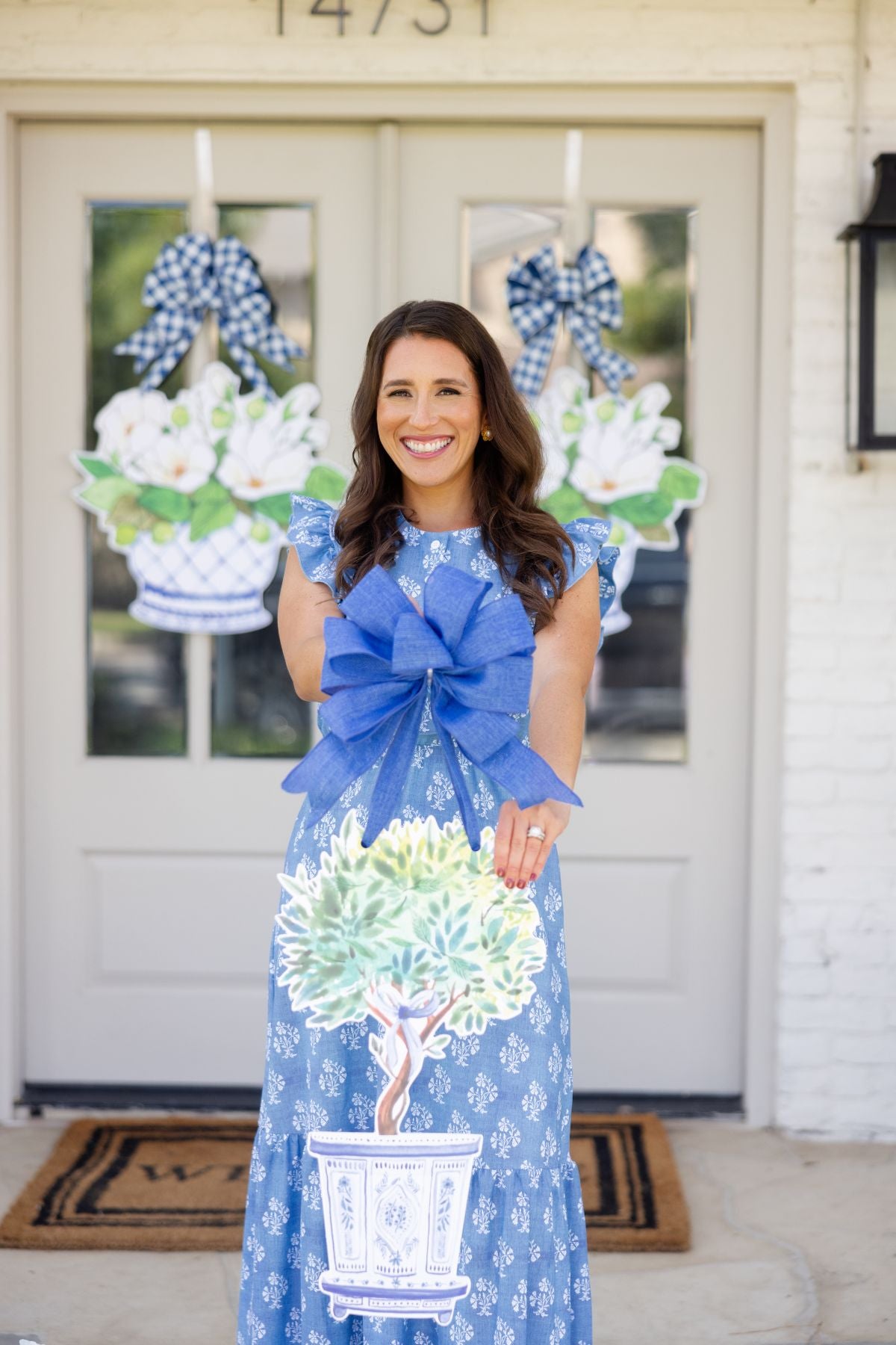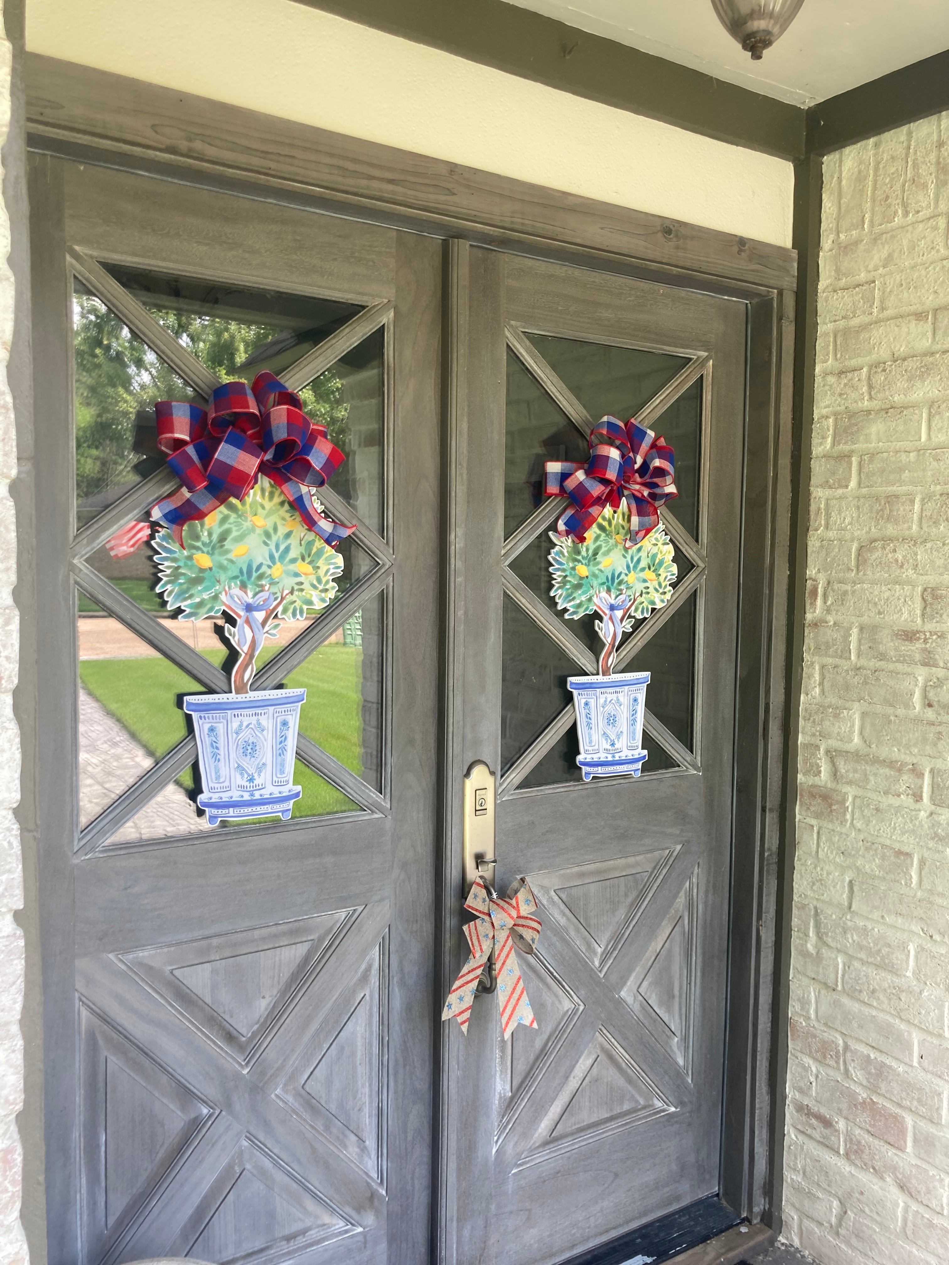 I absolutely love my purchases. I put her the blue and white triple pumpkins with a navy bow. I also purchased the Rebecca to hang inside my home on a door leading to a power level. The packaging is beautiful. The products unique and perfect !