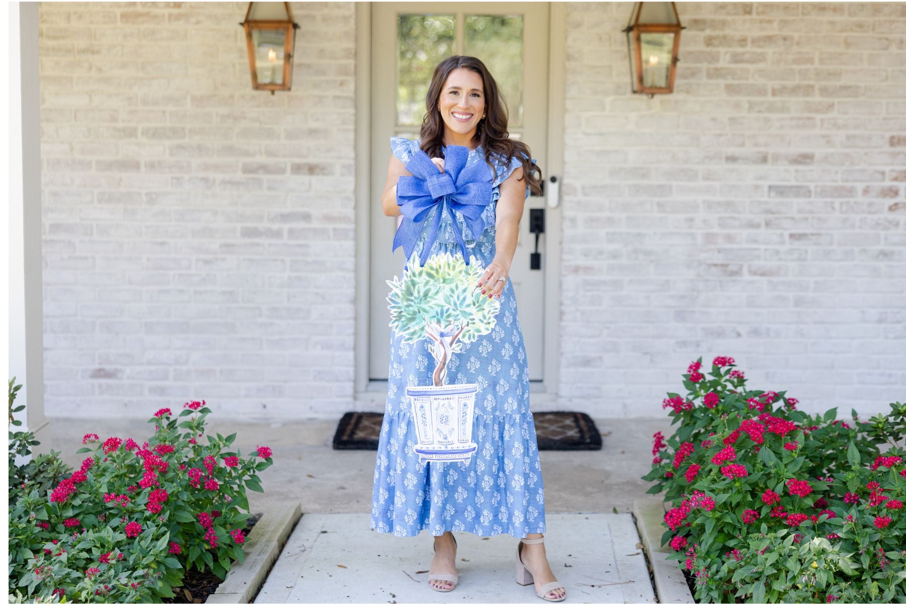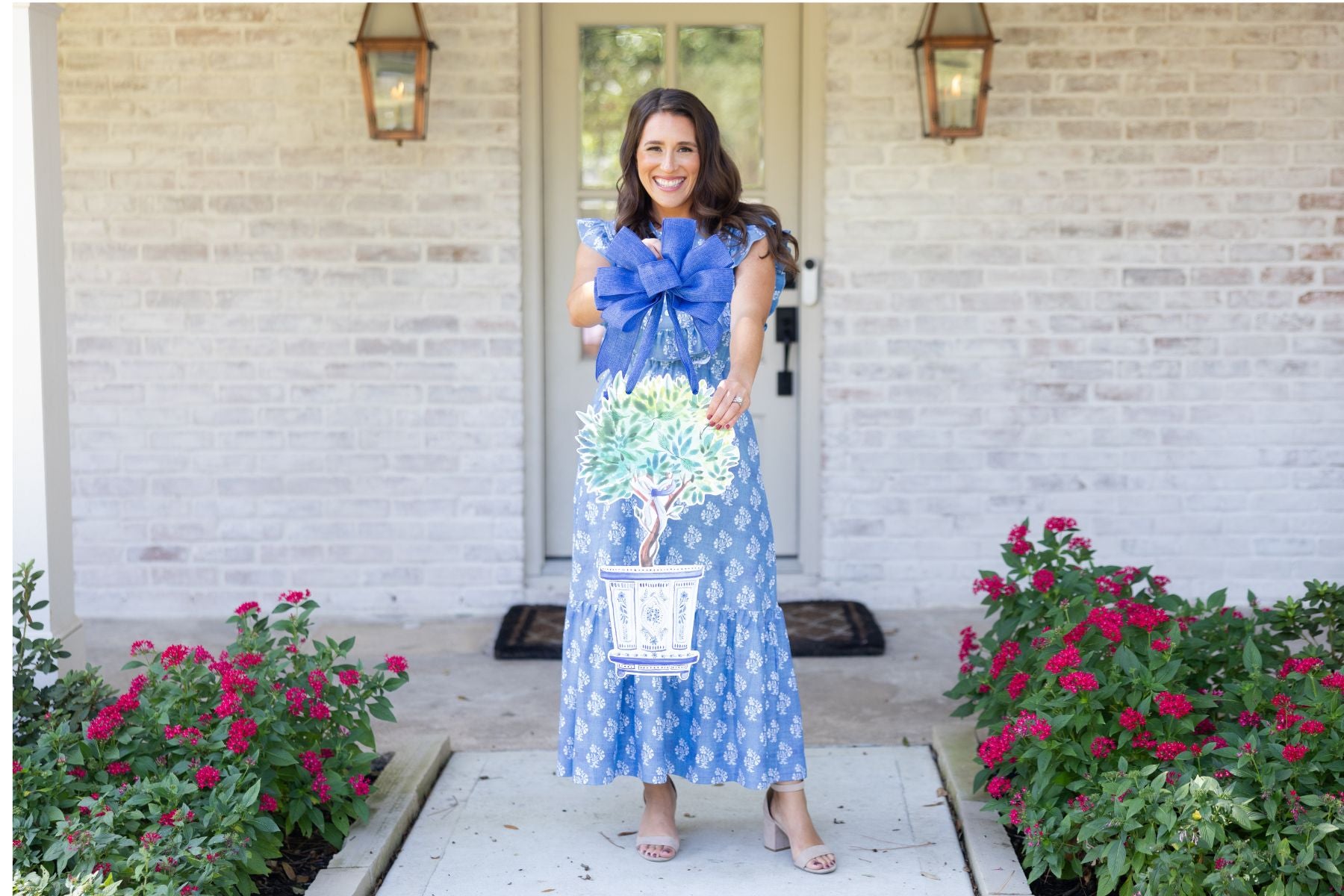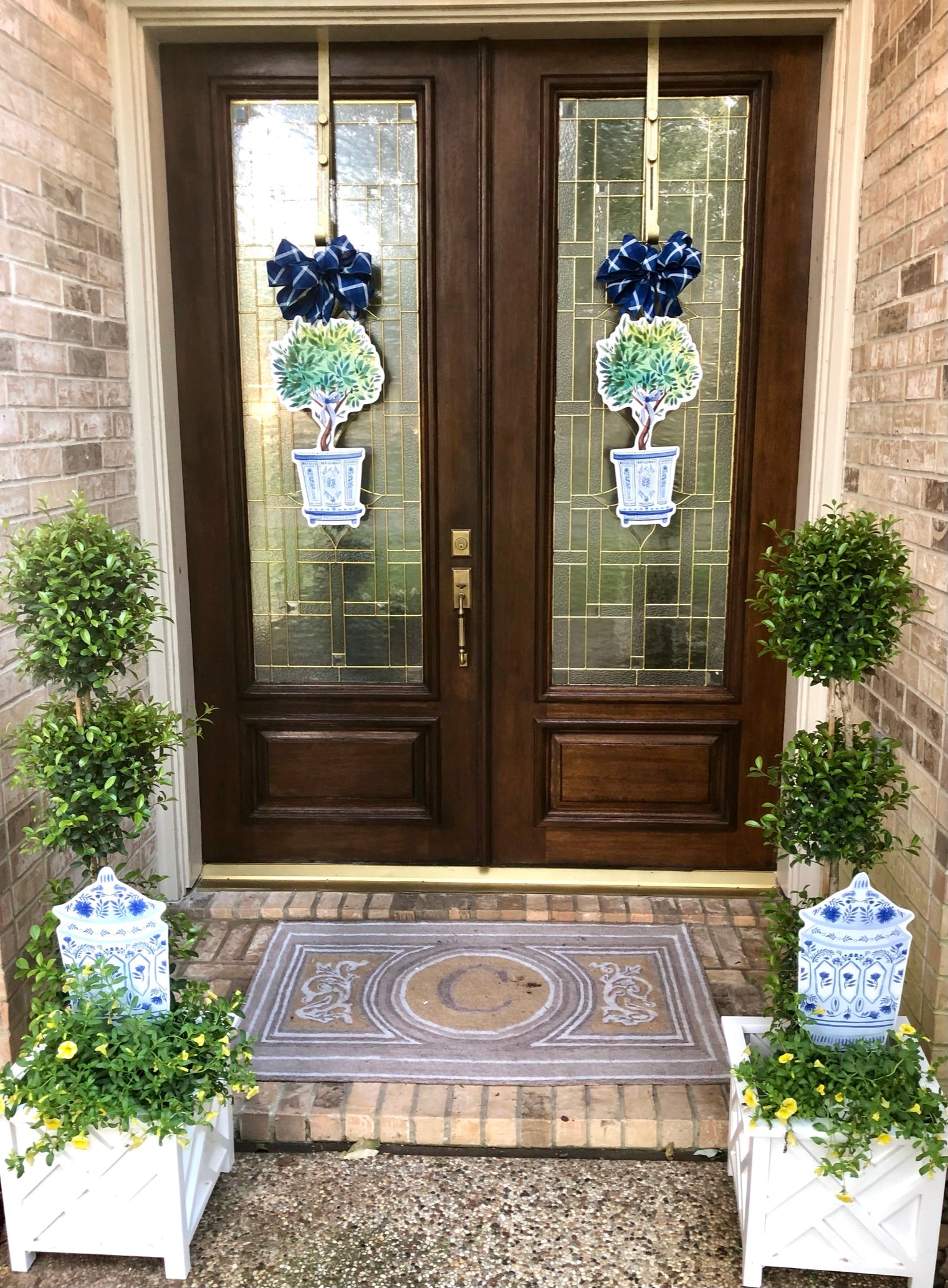 I absolutely love my purchases. I put her the blue and white triple pumpkins with a navy bow. I also purchased the Rebecca to hang inside my home on a door leading to a power level. The packaging is beautiful. The products unique and perfect !