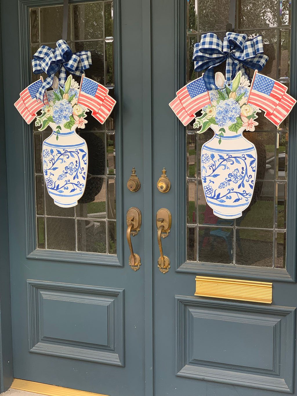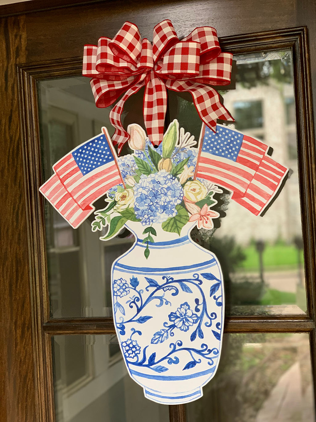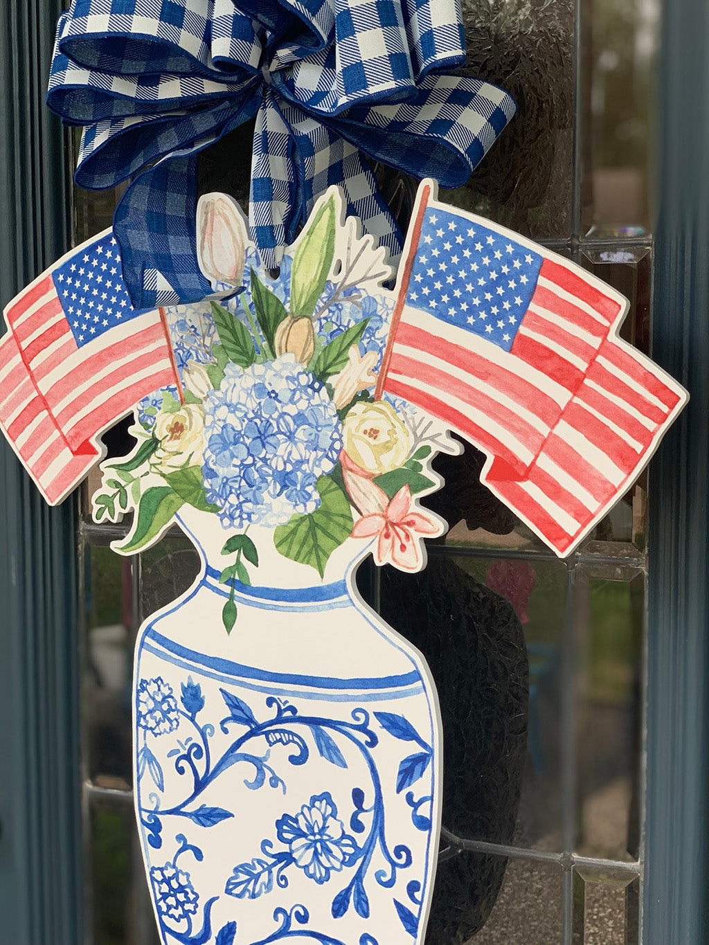 The perfect way to mix our love for the USA with our love for chinoiserie! It is approximately a 24” x 22” door hanger with a ½” hole.
