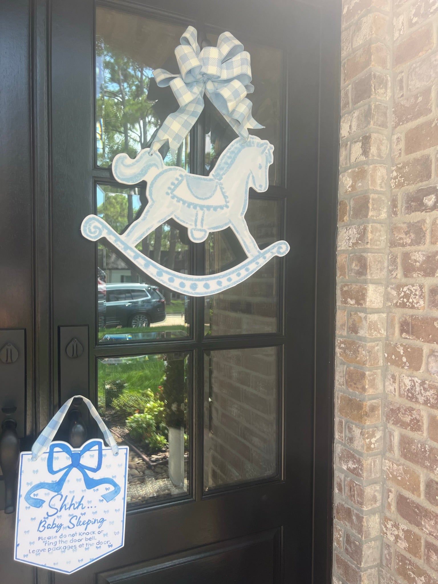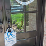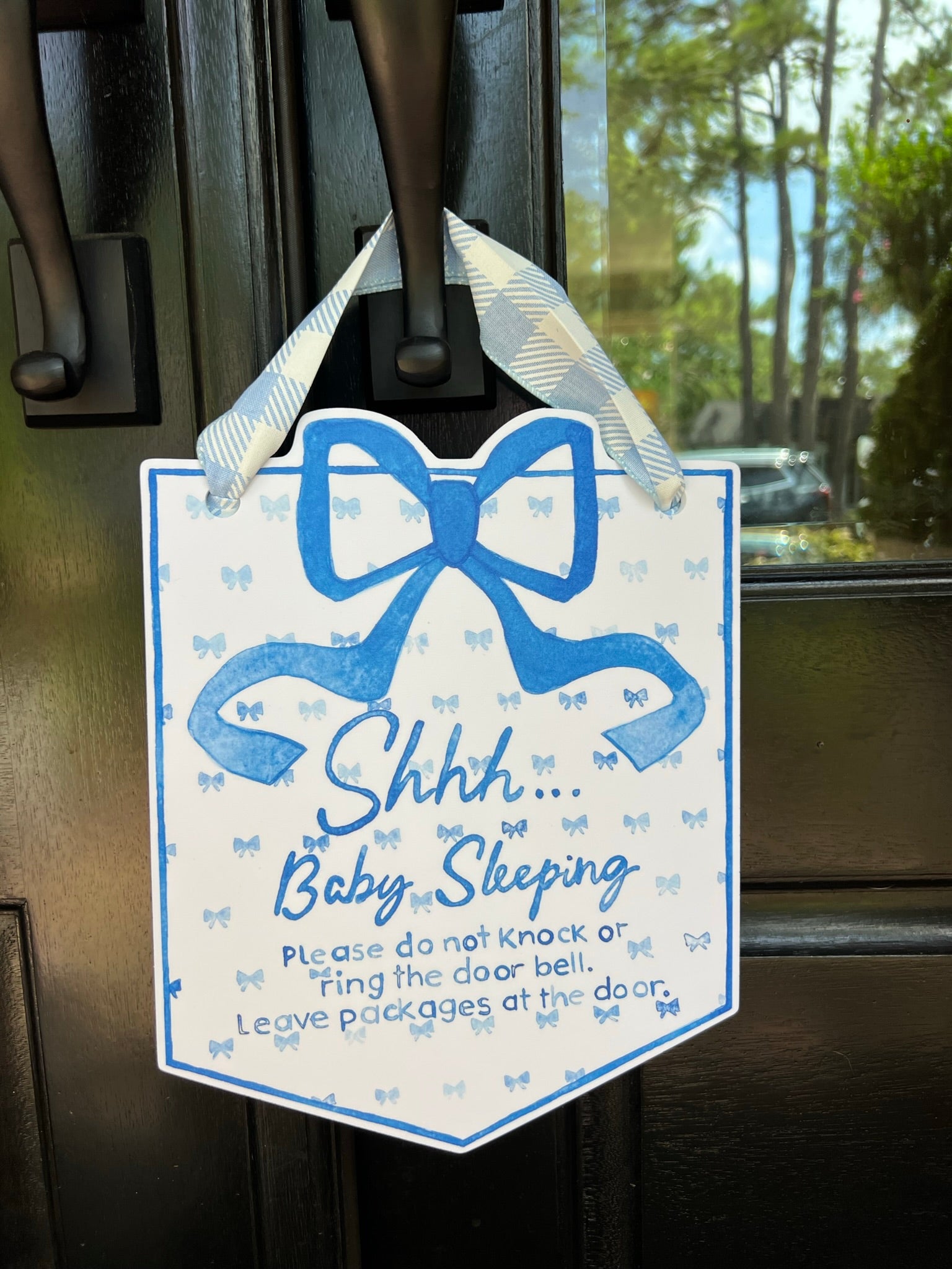 Perfect for your new bundle of joy! Produced with fade and weather resistant material this sign is perfect to keep others from ringing your door bell and waking a sleeping baby! The sign measures approximately 9.3” x 11.7” . These door hangers come with a light blue and white gingham hanging ribbon.