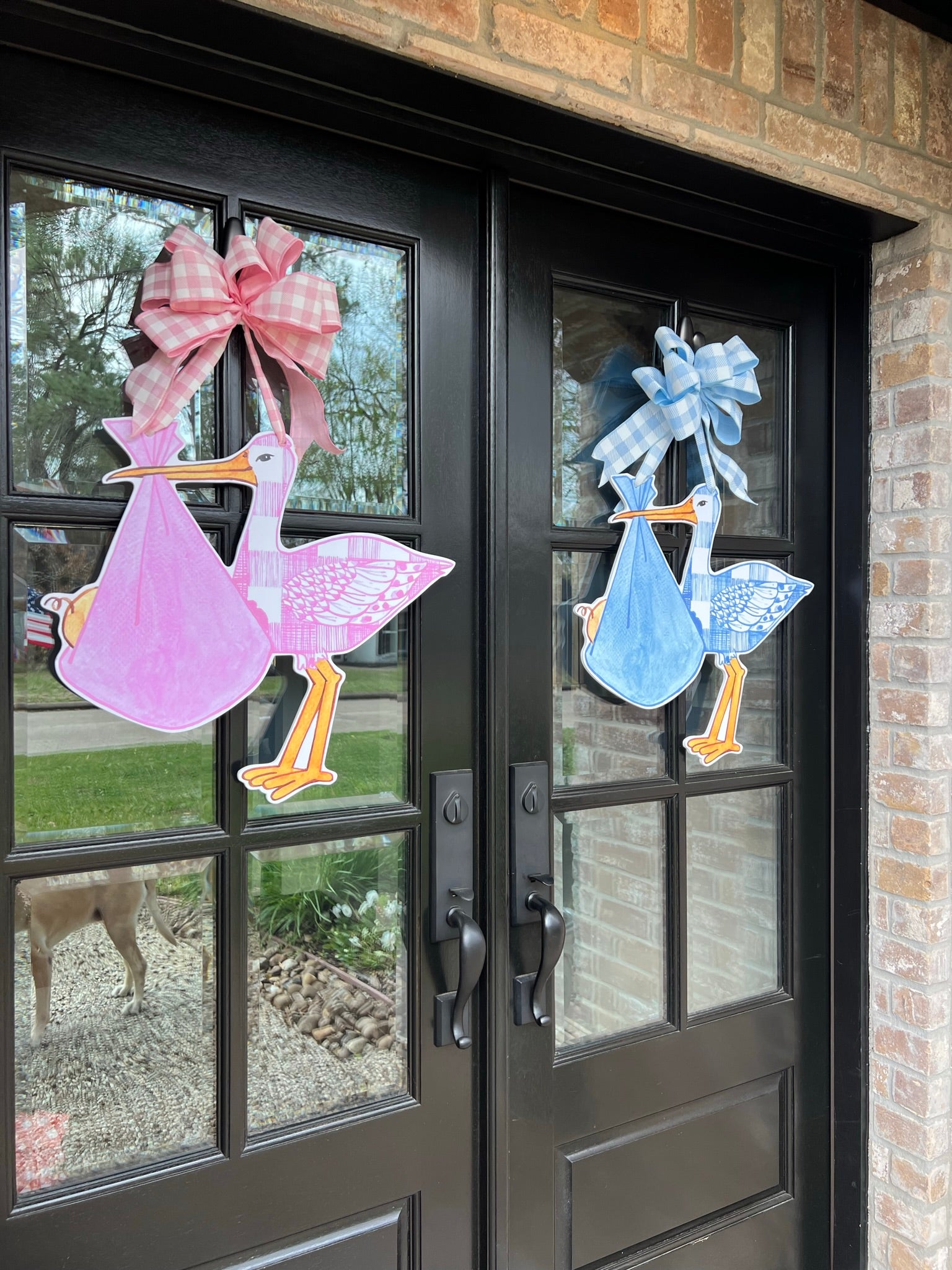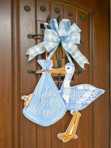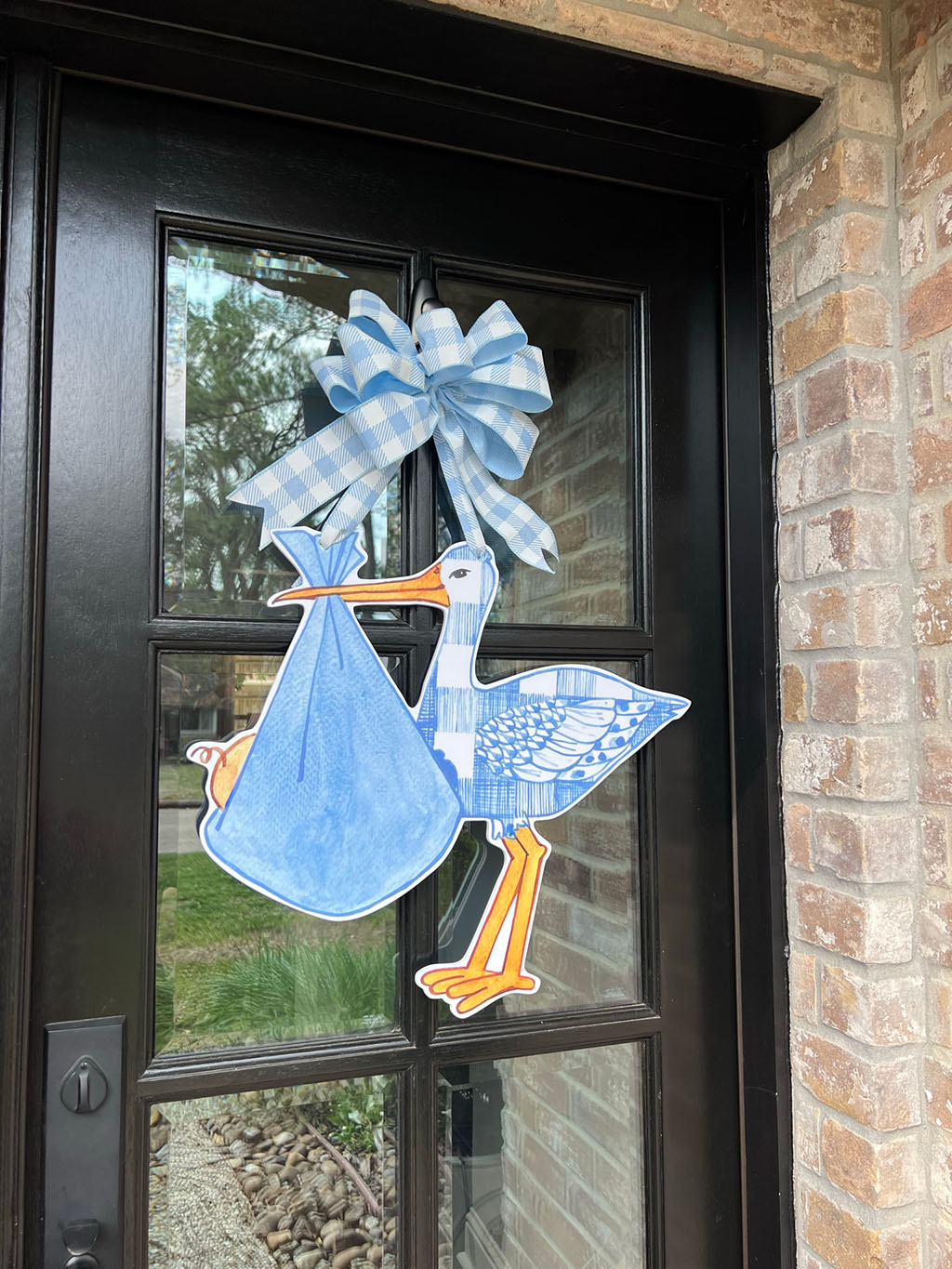 Blue Stork with Pattern Welcome Baby Boy with a Home Themed Home Stork! The stork measures approximately 23”x 20”. Please note that the stork legs are delicate and must be handled with care.
