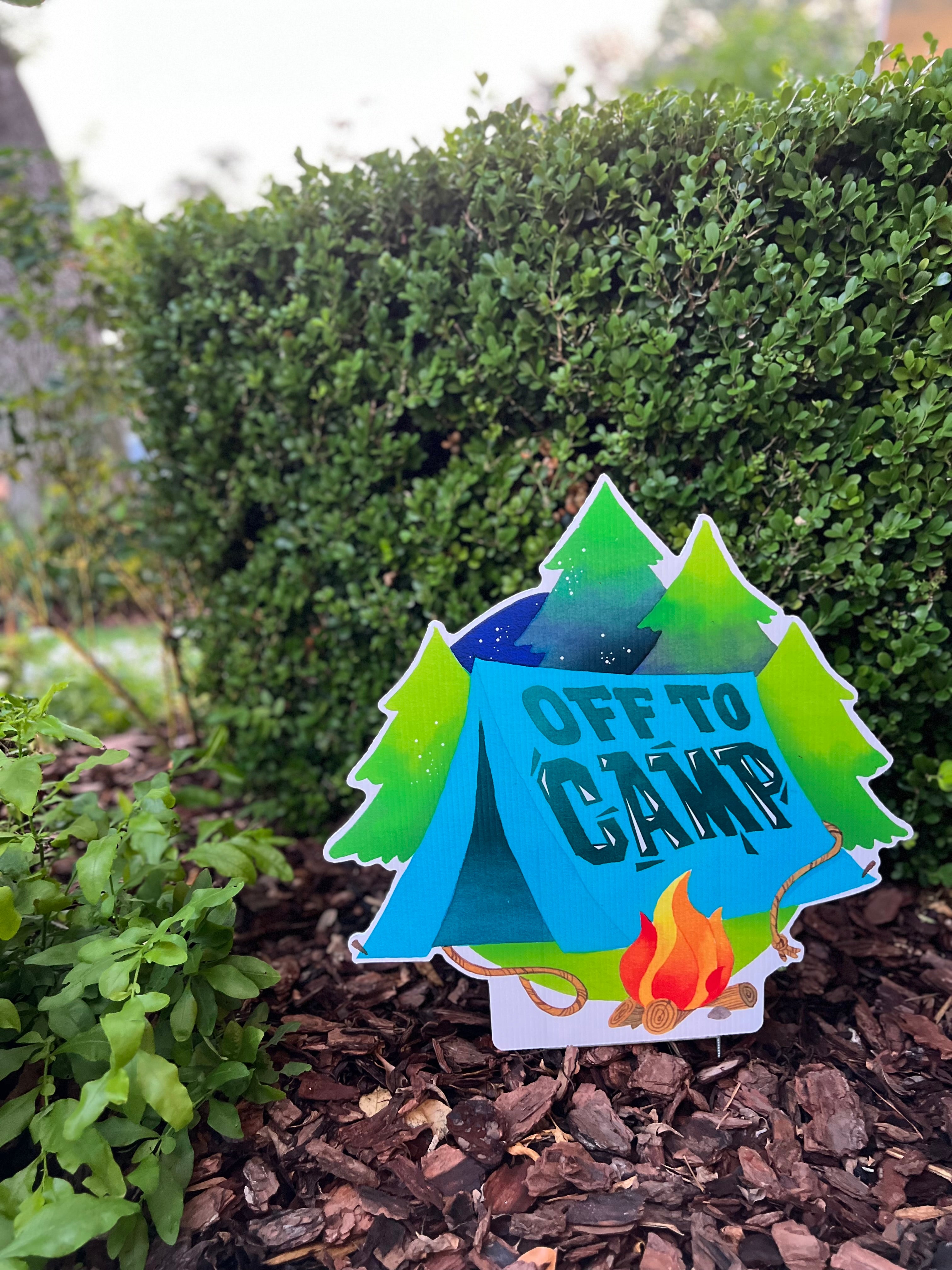 The Off to Camp Yard Stake measures approximately 19" x 19".