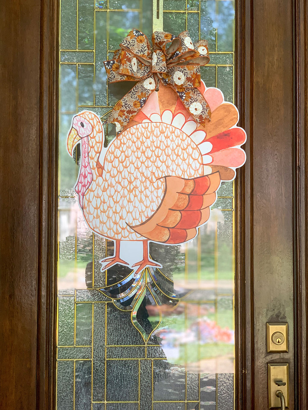 Autumn is calling! The perfect grandmillenial Fall front door décor. The Charles is an orange Herend inspired turkey that is approximately 19" x 23"with two 1/2" holes.