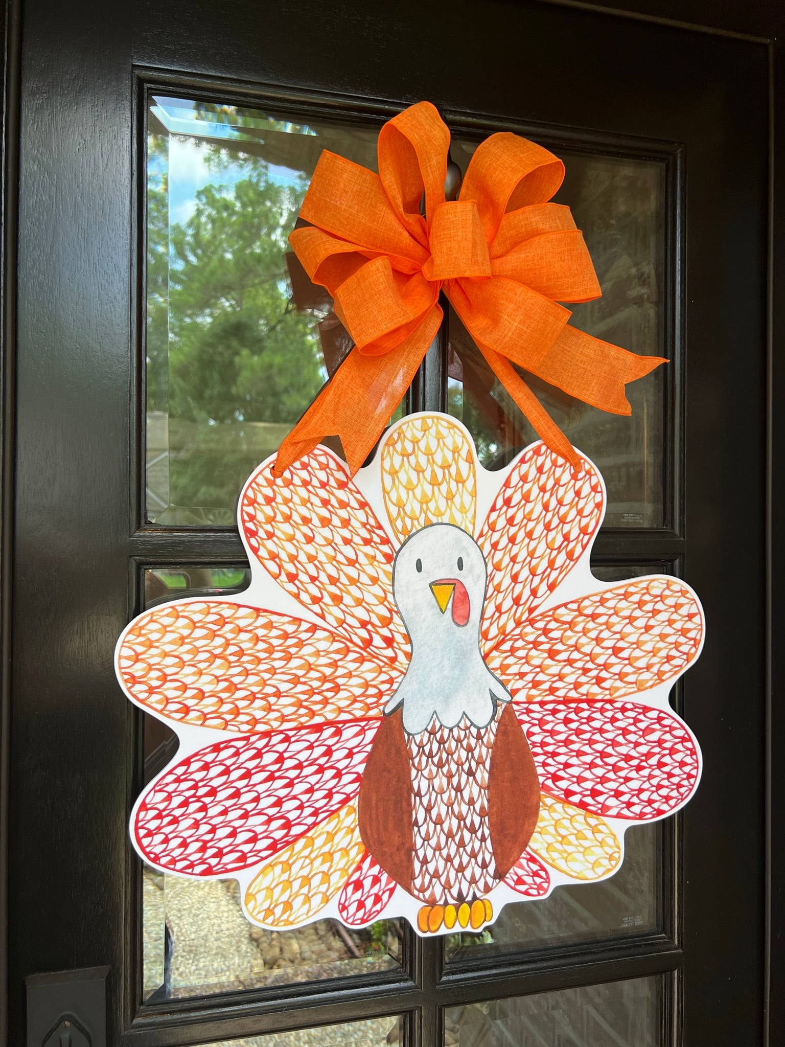 Feathers the Turkey Door Hanger Autumn is calling! The perfect grandmillenial Fall front door décor. This door hanger is approximately 23" x 19.5".