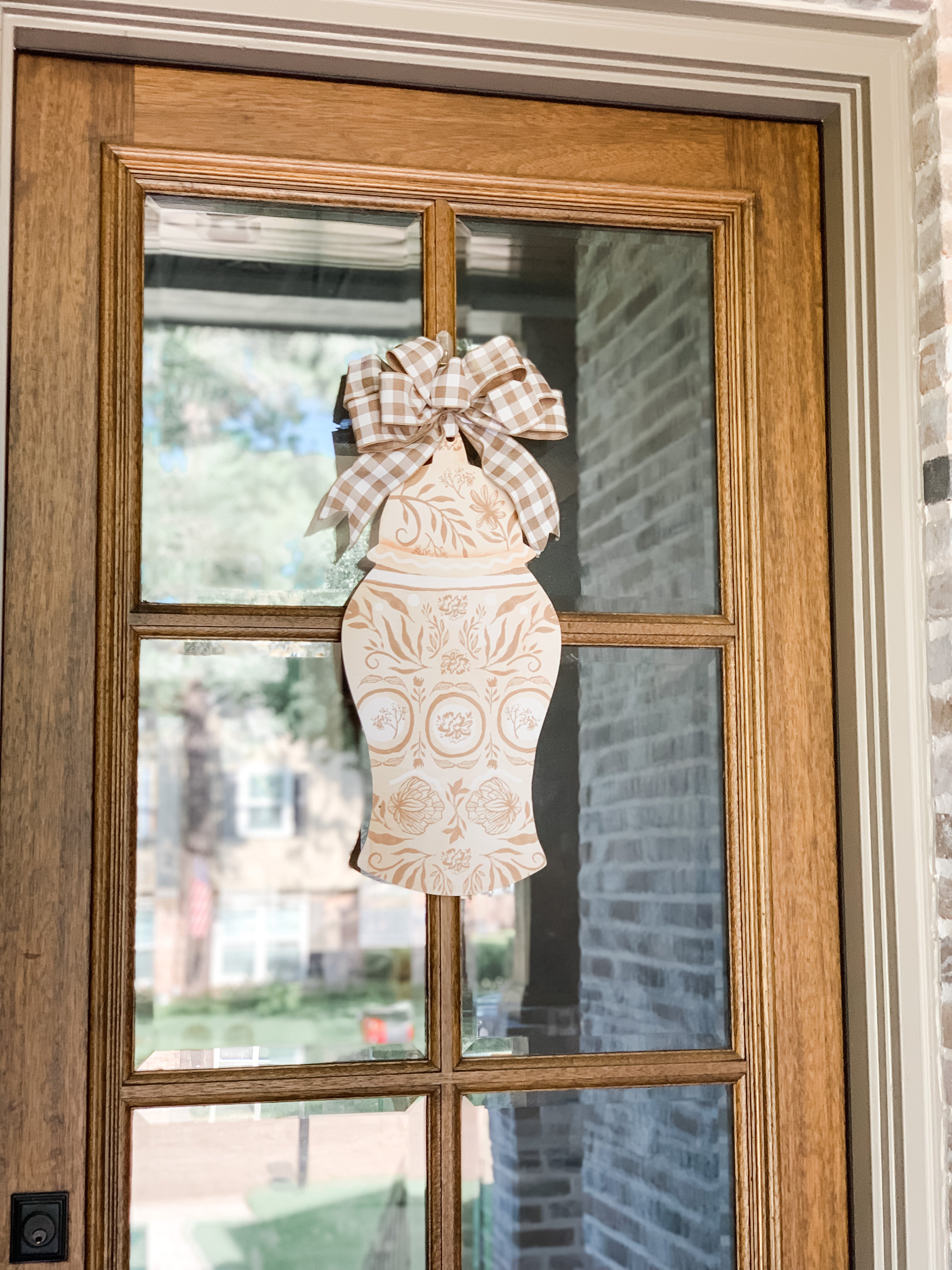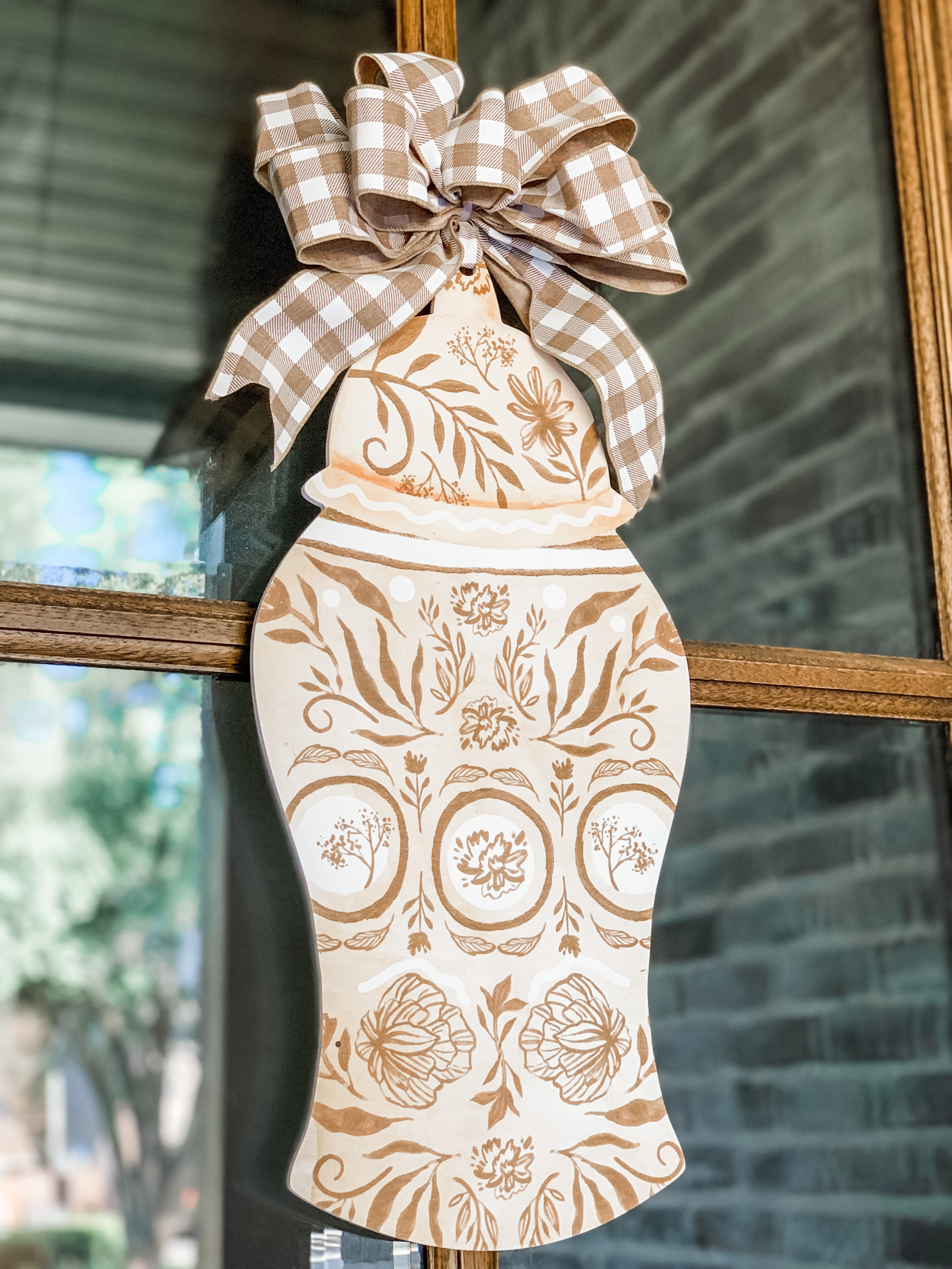The perfect grandmillenial front door décor. The Francesca Ginger Jar door hanger is approximately 11" x 23" with one 1/2" hole, Pairs well with the Francesca Yard/Pot Stake.