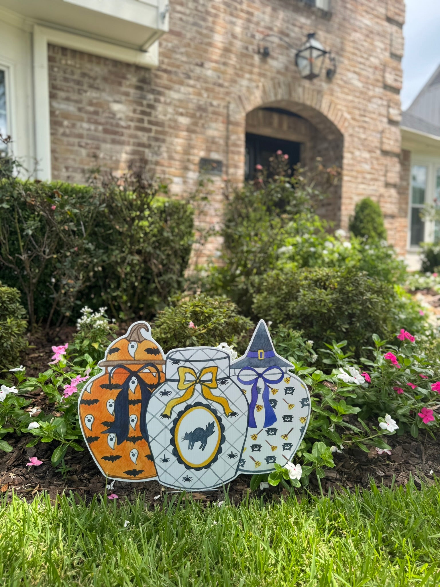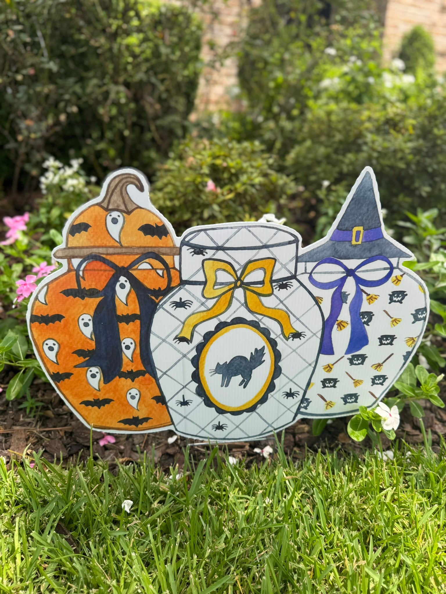 Halloween Ginger Jars Trio with Yellow Bow Yard Stake