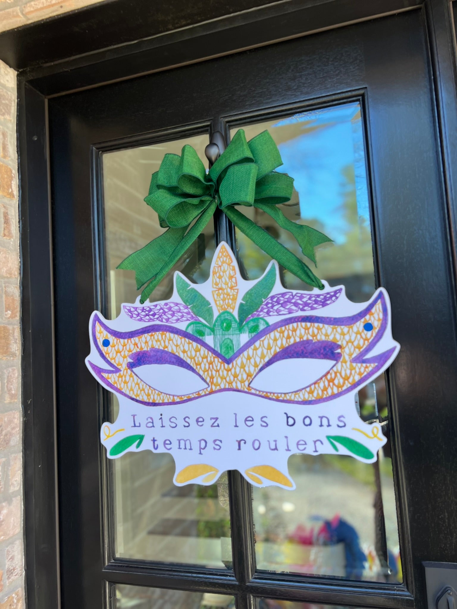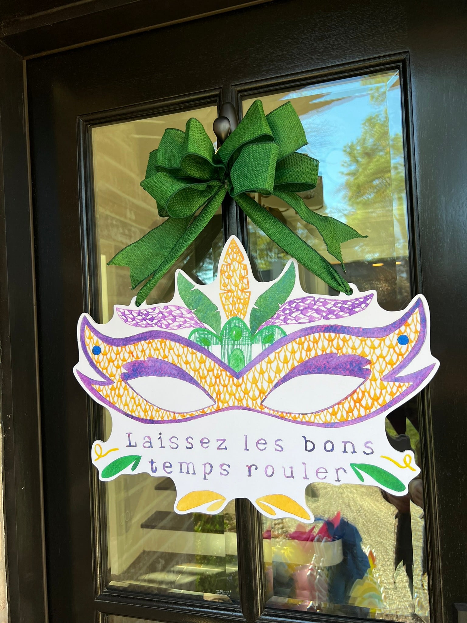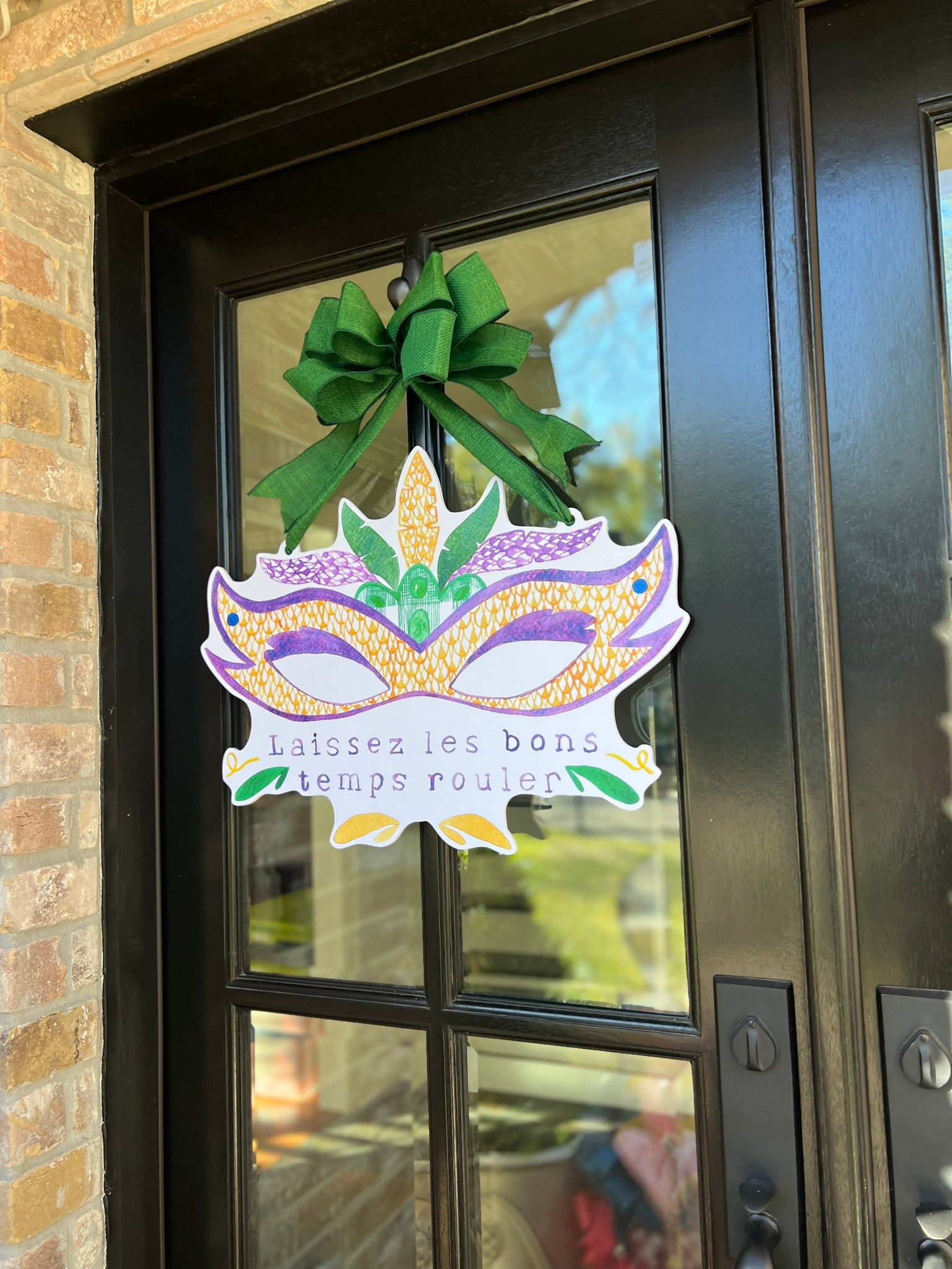 Mardi Gras Mask Door Hanger measures approximately 17.50" x 23"