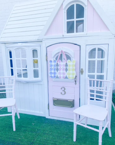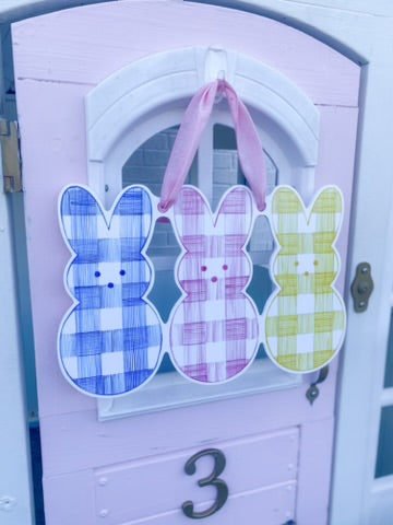 The Mini Melissa Gingham Peeps Door Hanger measures approximately 7" x 15". It is perfect for a children's playhouse.