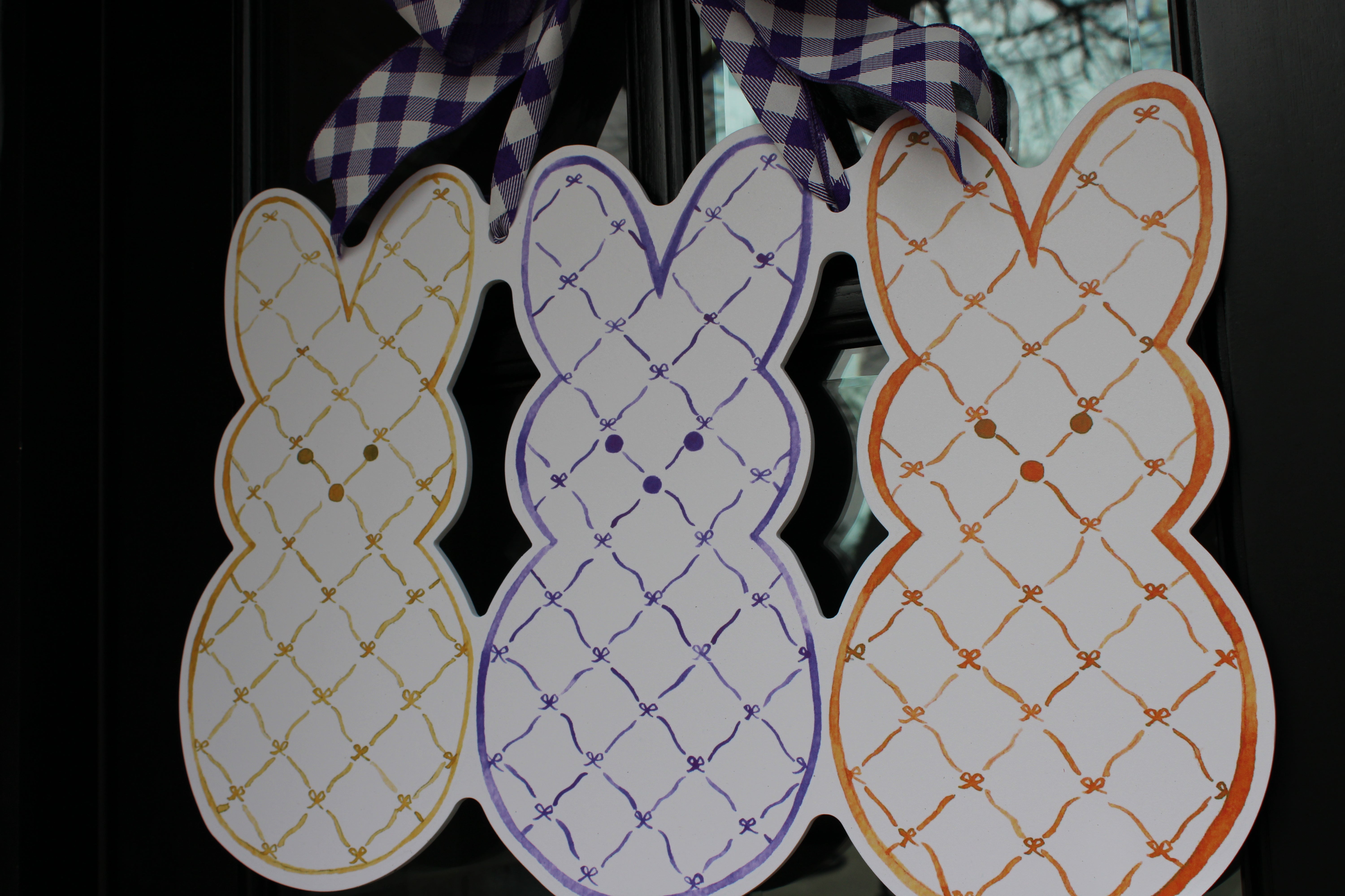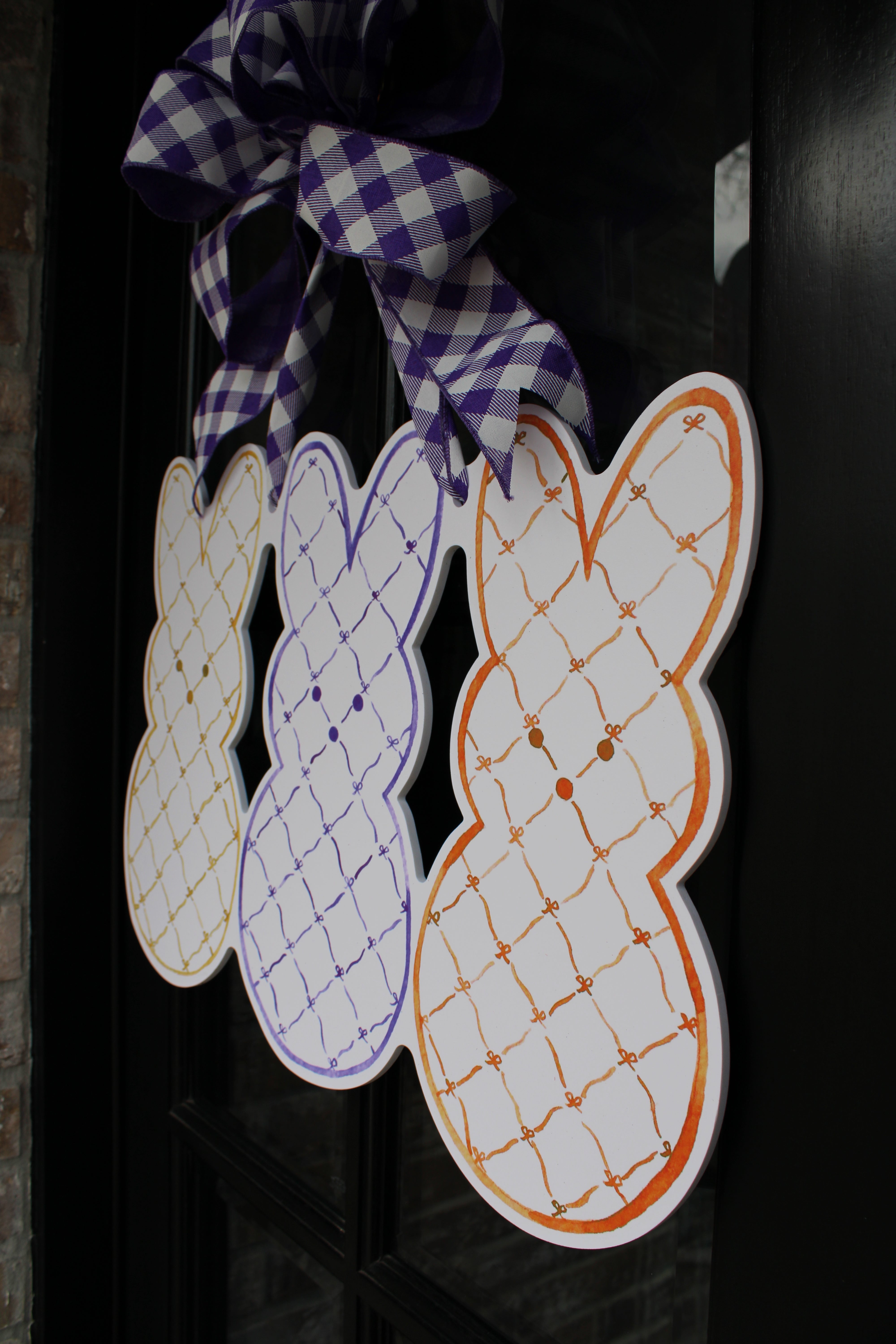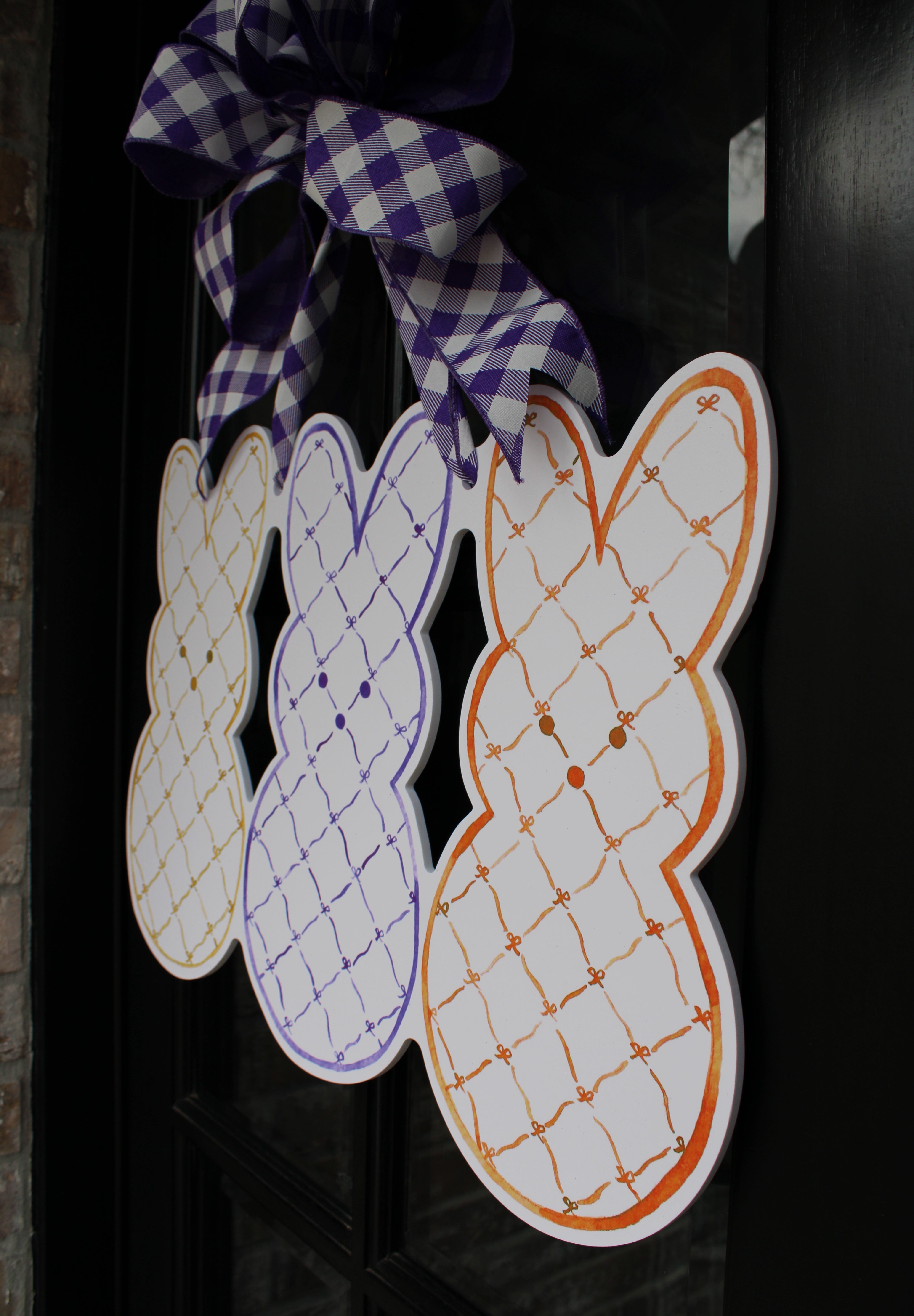 Featuring three oversized bunny shapes adorned in a delicate hand-drawn lattice pattern, this trio blends timeless design with fresh seasonal color. Soft golden yellow, rich violet, and warm orange create a palette that feels polished yet playful — perfect for welcoming guests all spring long.