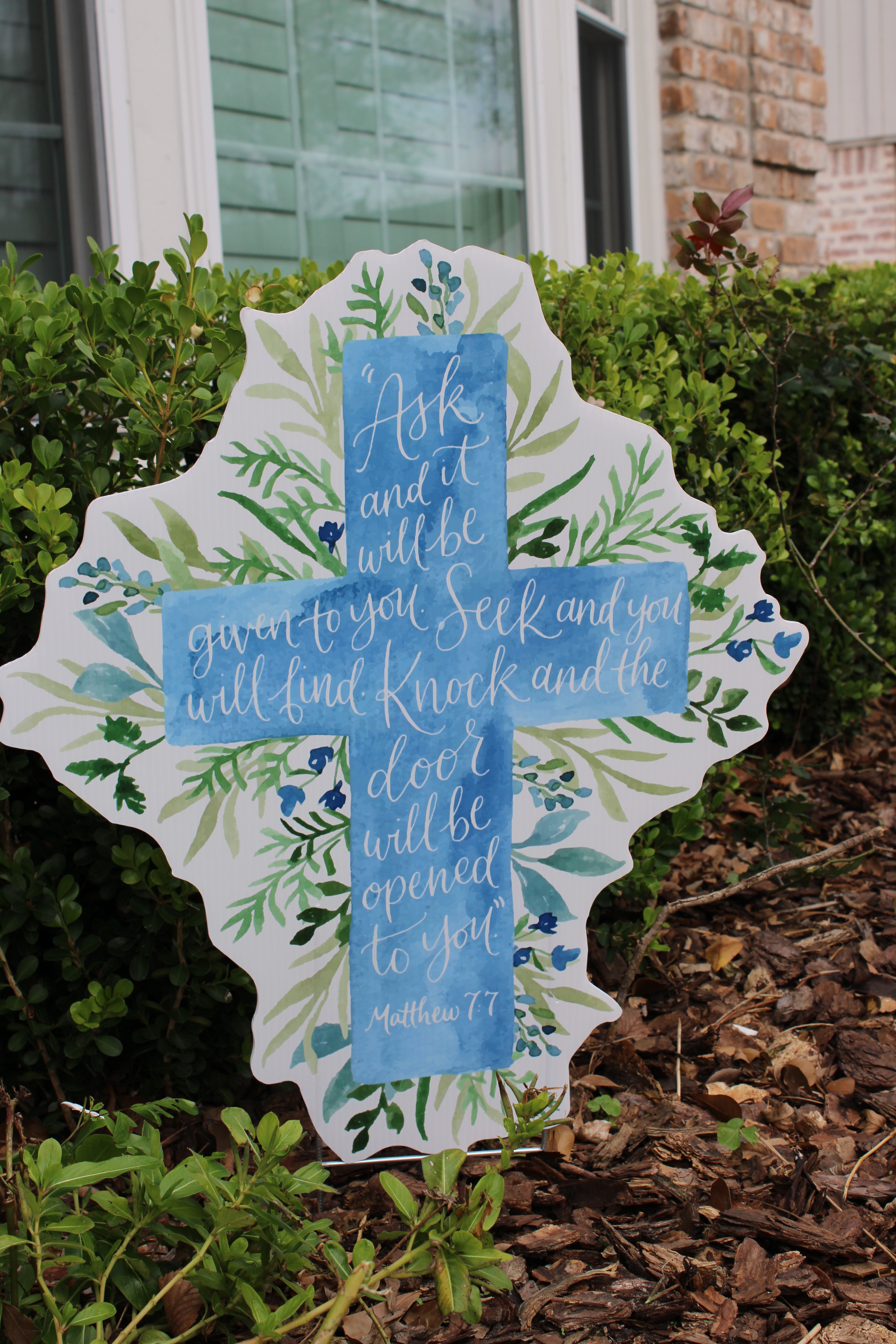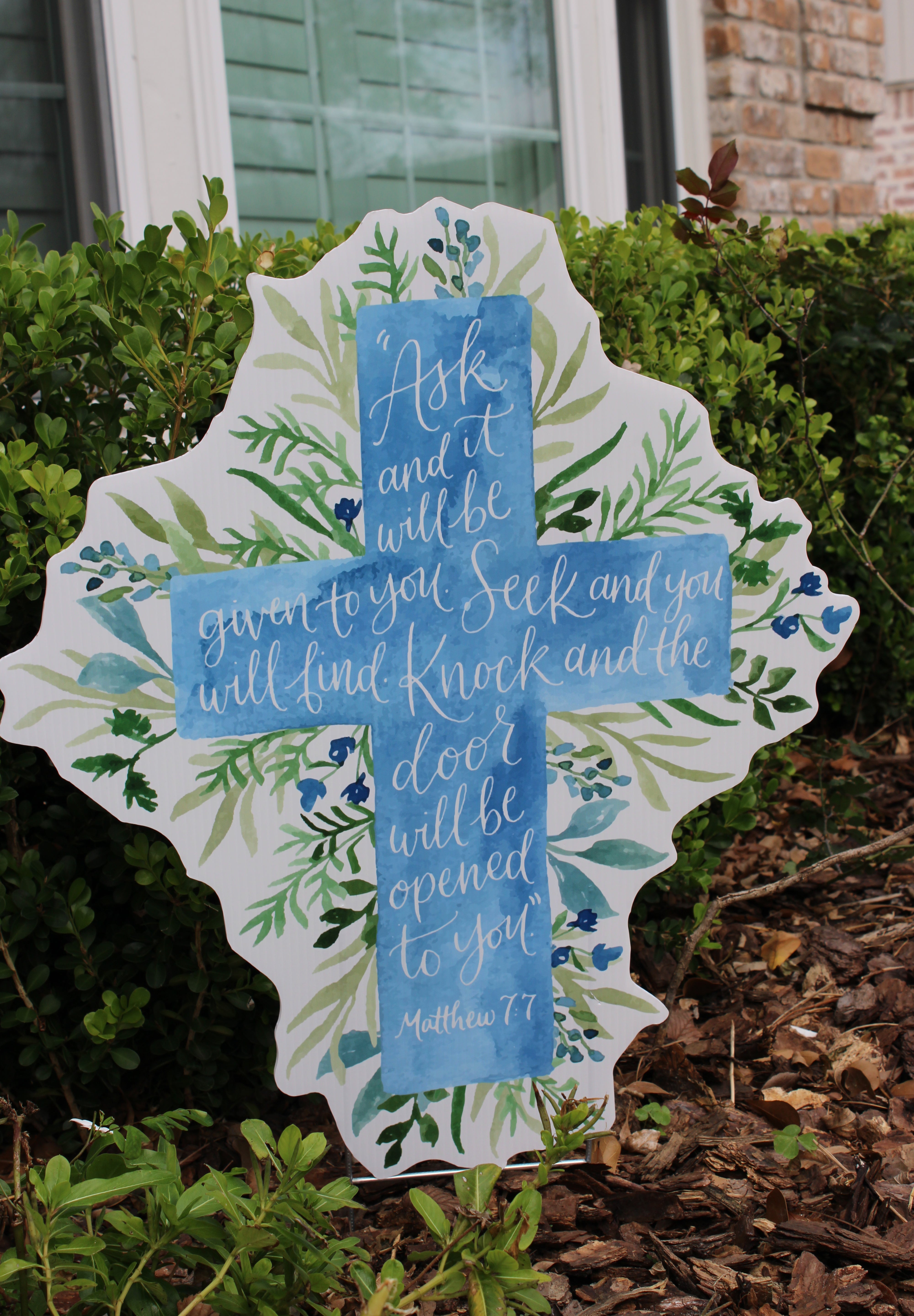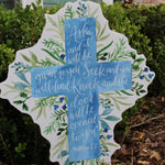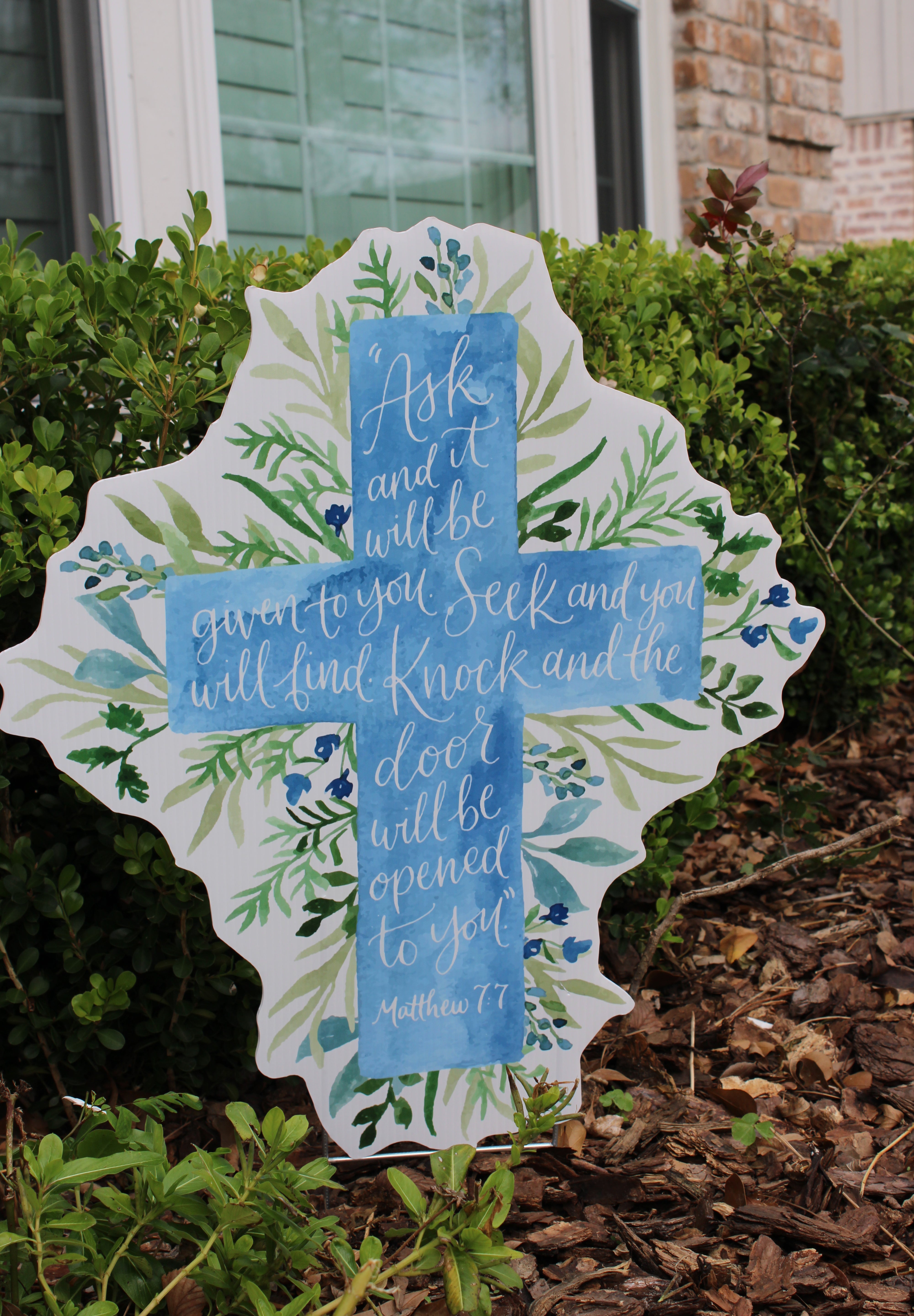 Featuring soft watercolor blues layered over lush greenery, this cross centers around the powerful promise of Matthew 7:7:“Ask and it will be given to you; seek and you will find; knock and the door will be opened to you.”