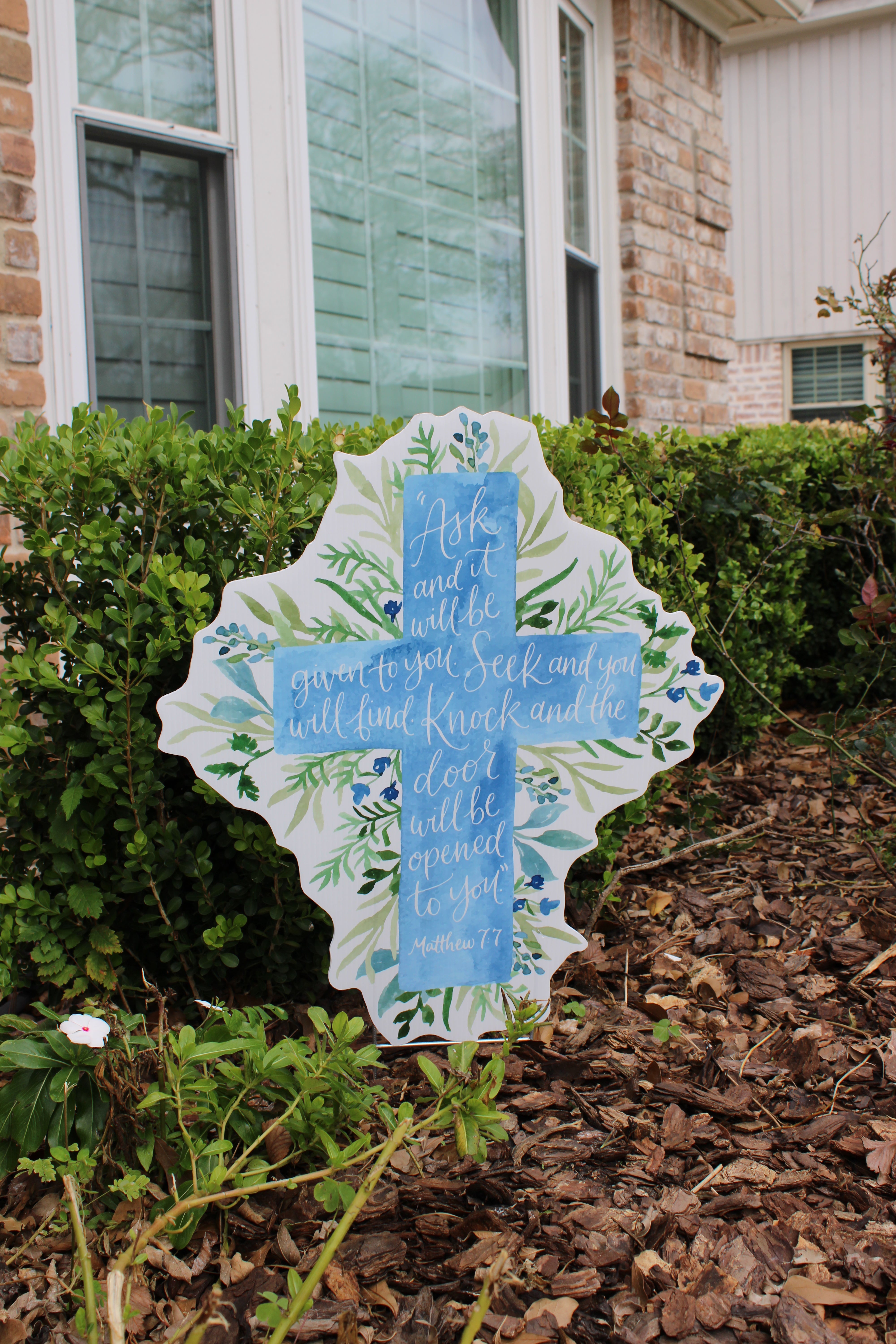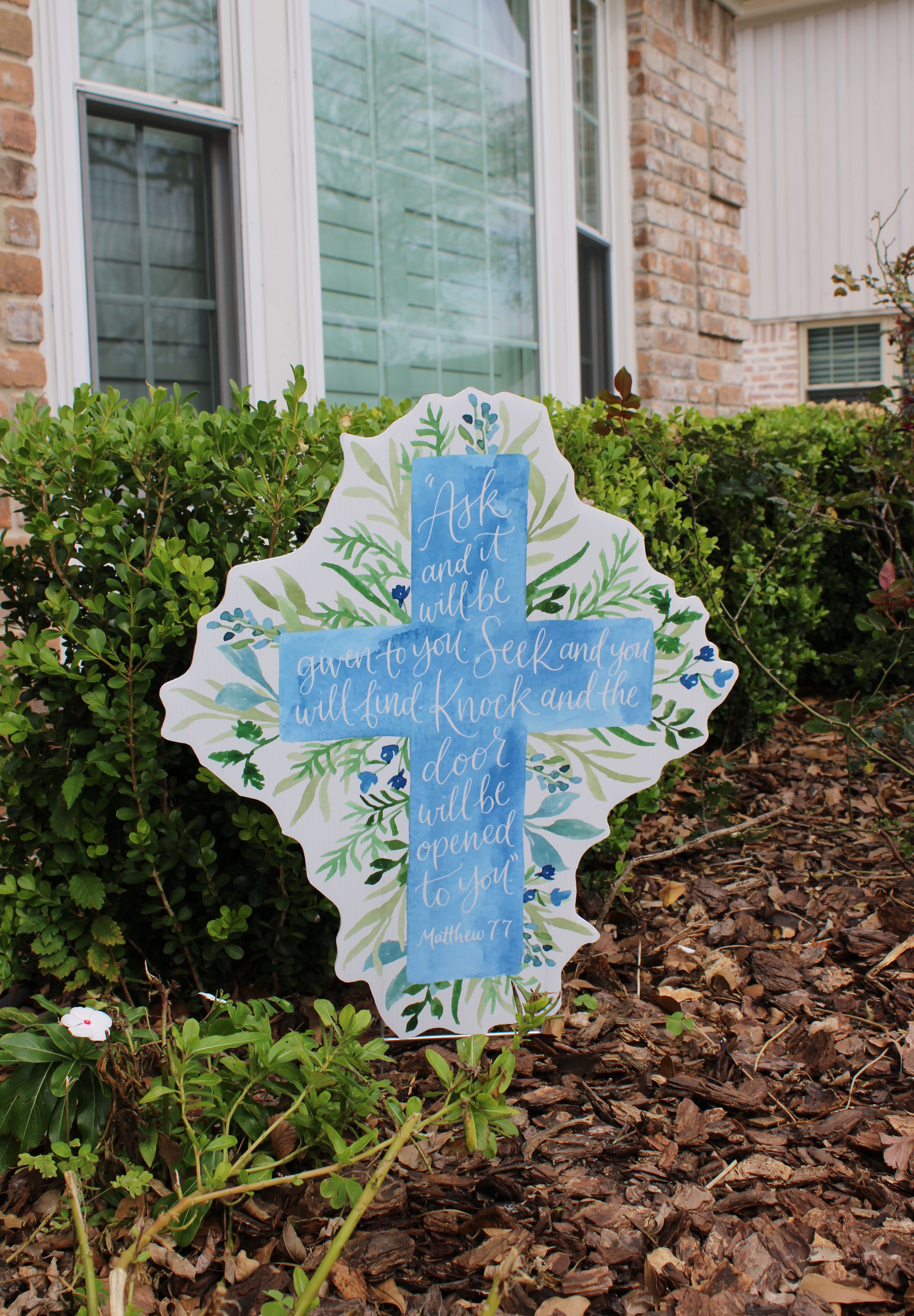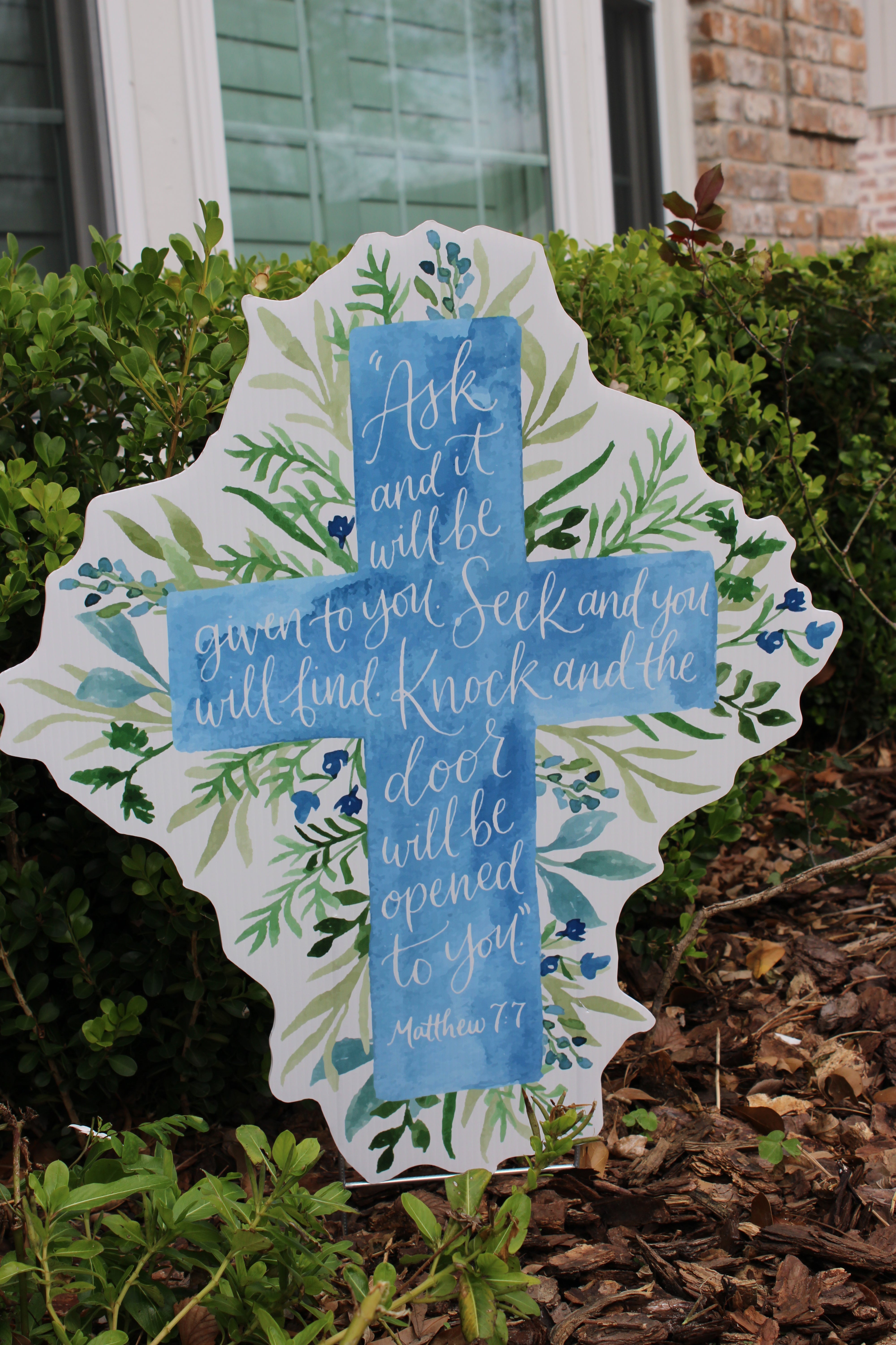 Featuring soft watercolor blues layered over lush greenery, this cross centers around the powerful promise of Matthew 7:7:“Ask and it will be given to you; seek and you will find; knock and the door will be opened to you.”